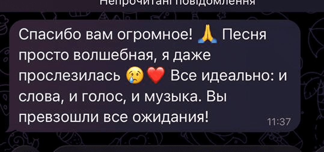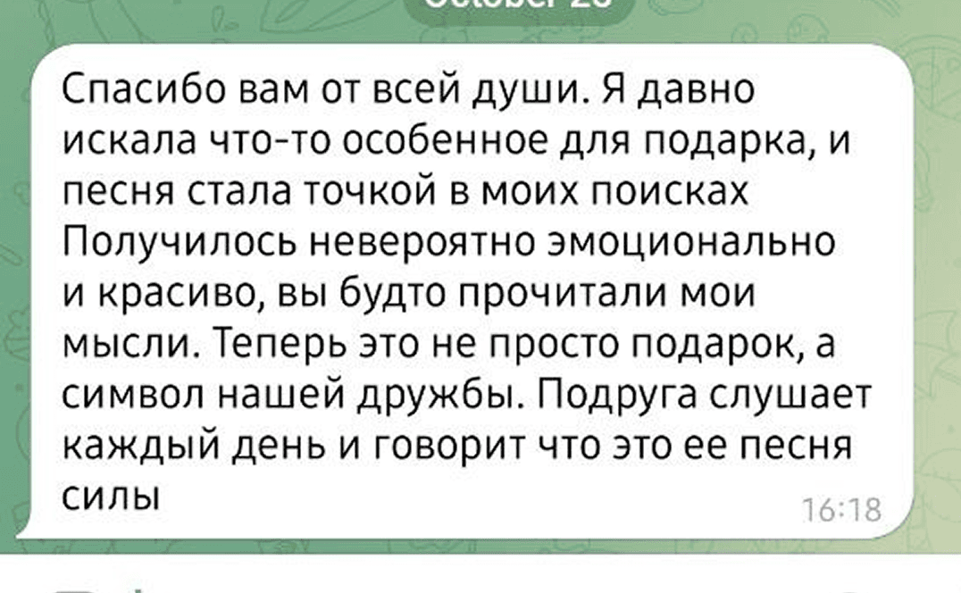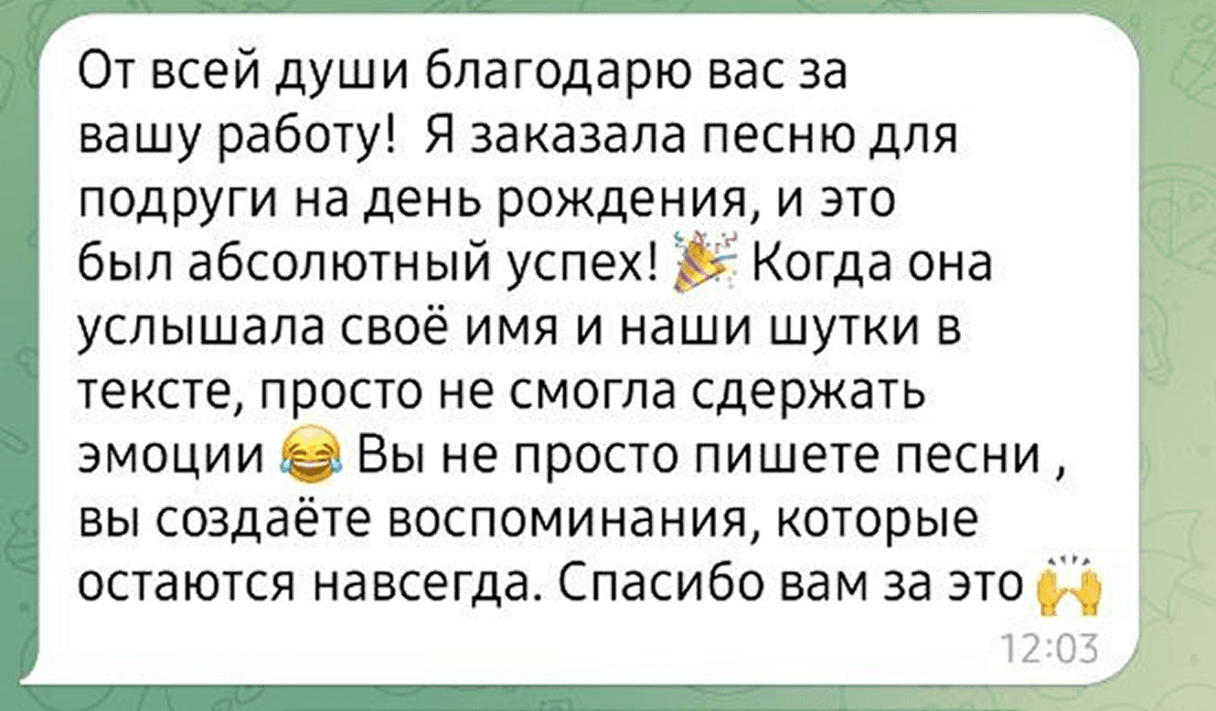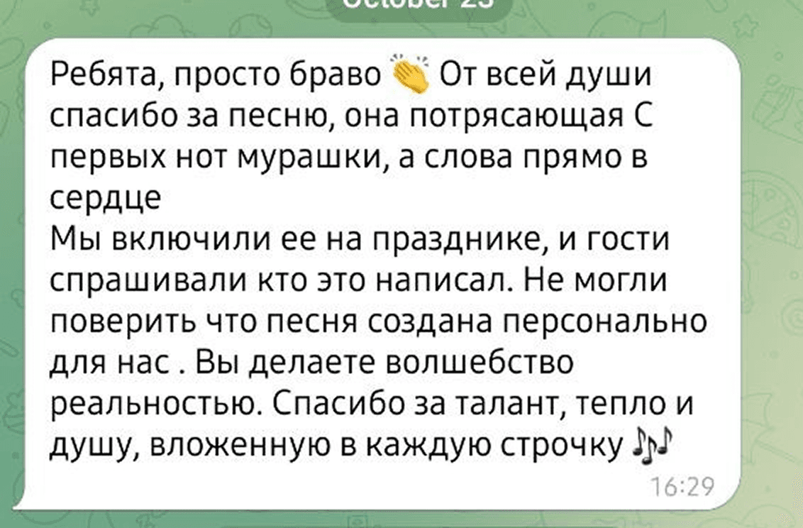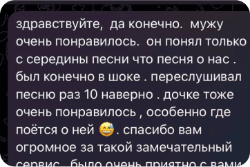 Мы делаем все, чтобы каждая песня была не просто заказом, а настоящим подарком, который останется в памяти.