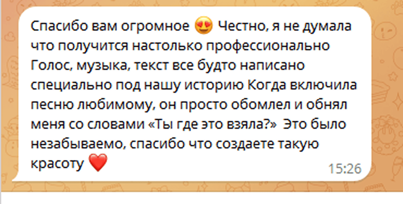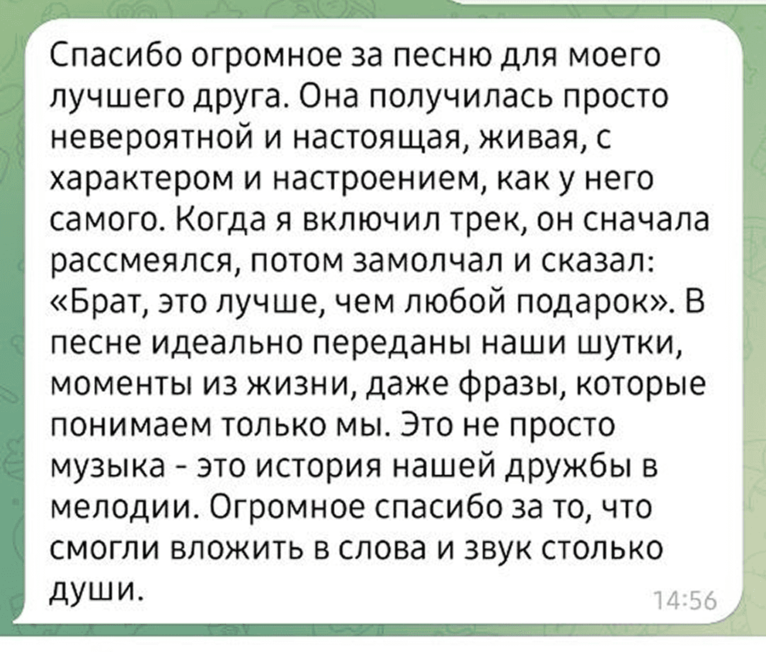 Мы создаем песню так, чтобы она звучала именно от вашего имени – будто это вы сами поете и рассказываете свою историю.