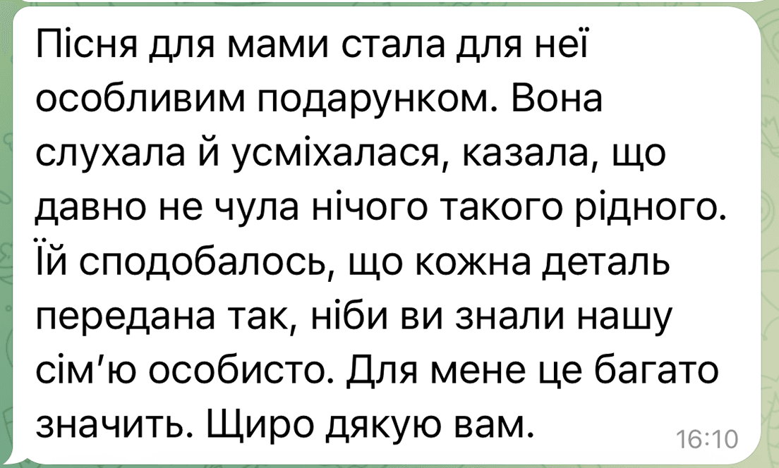 Це робить подарунок особливо особистим і щирим: людина чує пісню й відчуває – “це про мене, і від нього”.