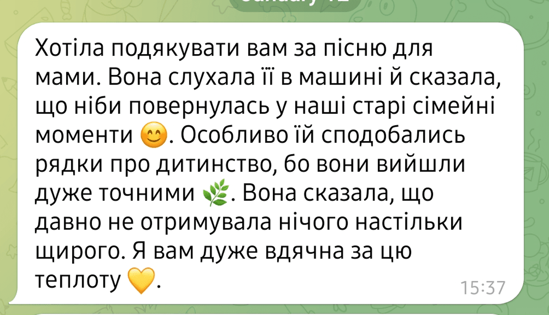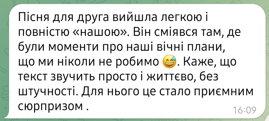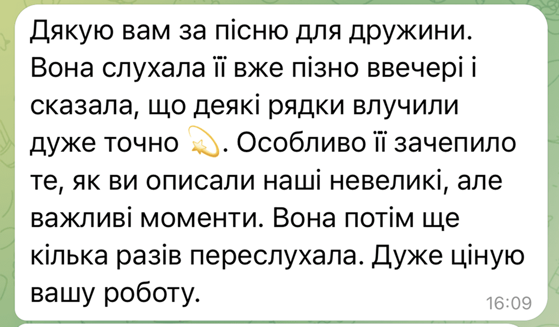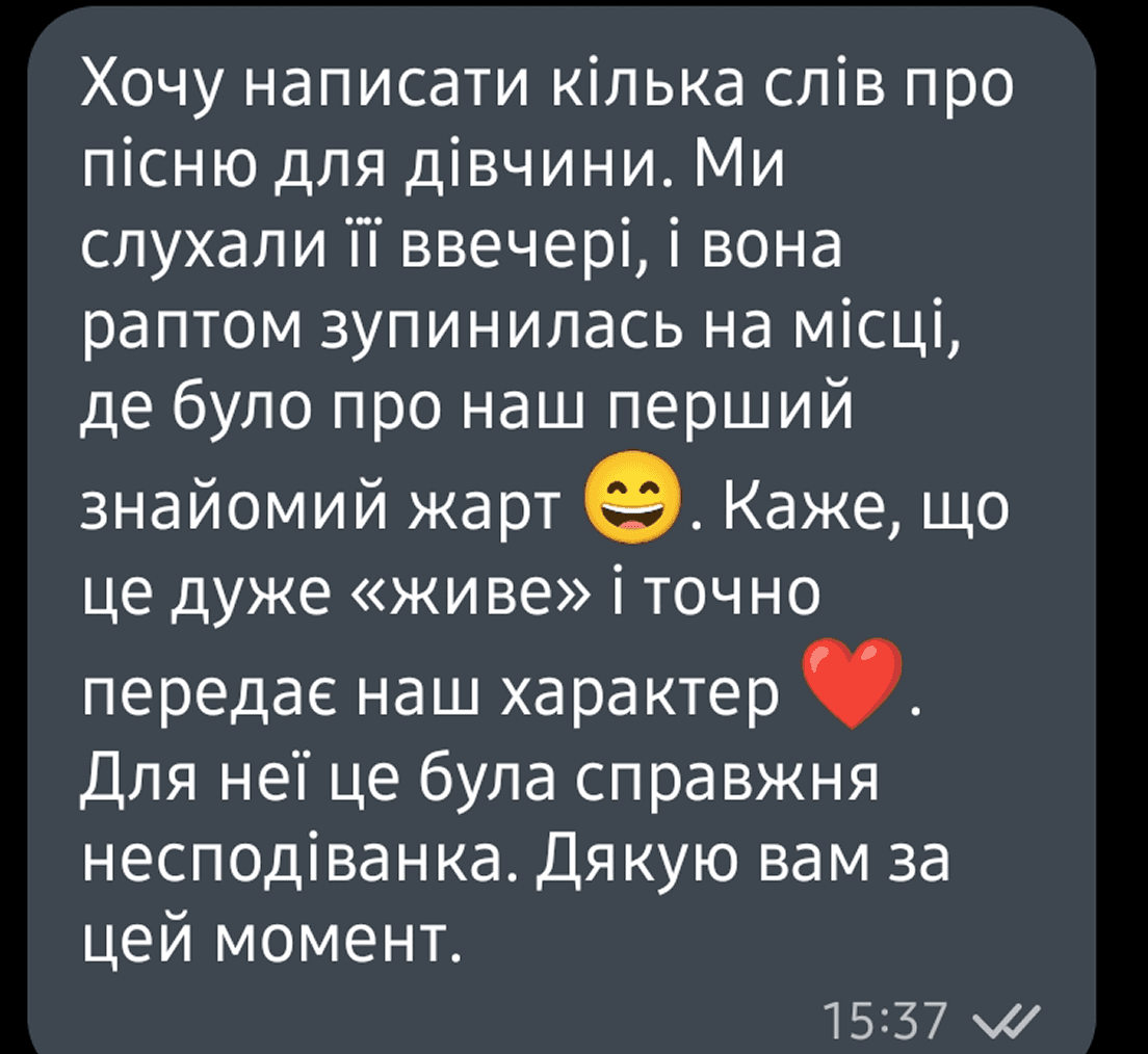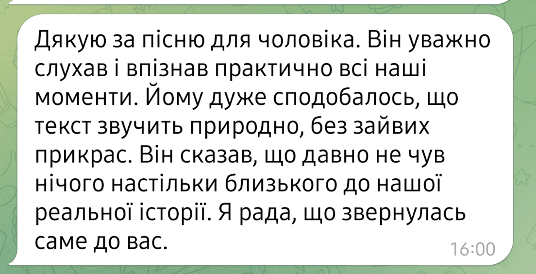 Пісня створюється у співпраці з вами, щоб максимально точно передати ваші почуття та сенси.